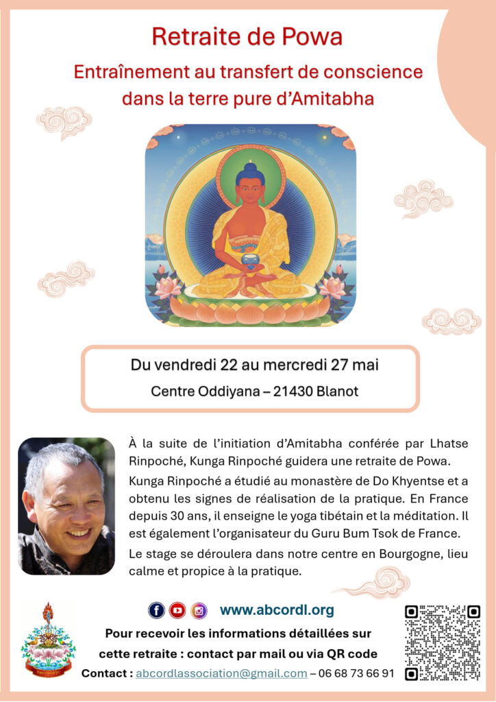 Kunga Rinpoché enseignera sur l’entraînement au transfert de conscience lors d’une retraite qui se tiendra du 22 au 27 mai 2026 dans notre centre en Bourgogne.